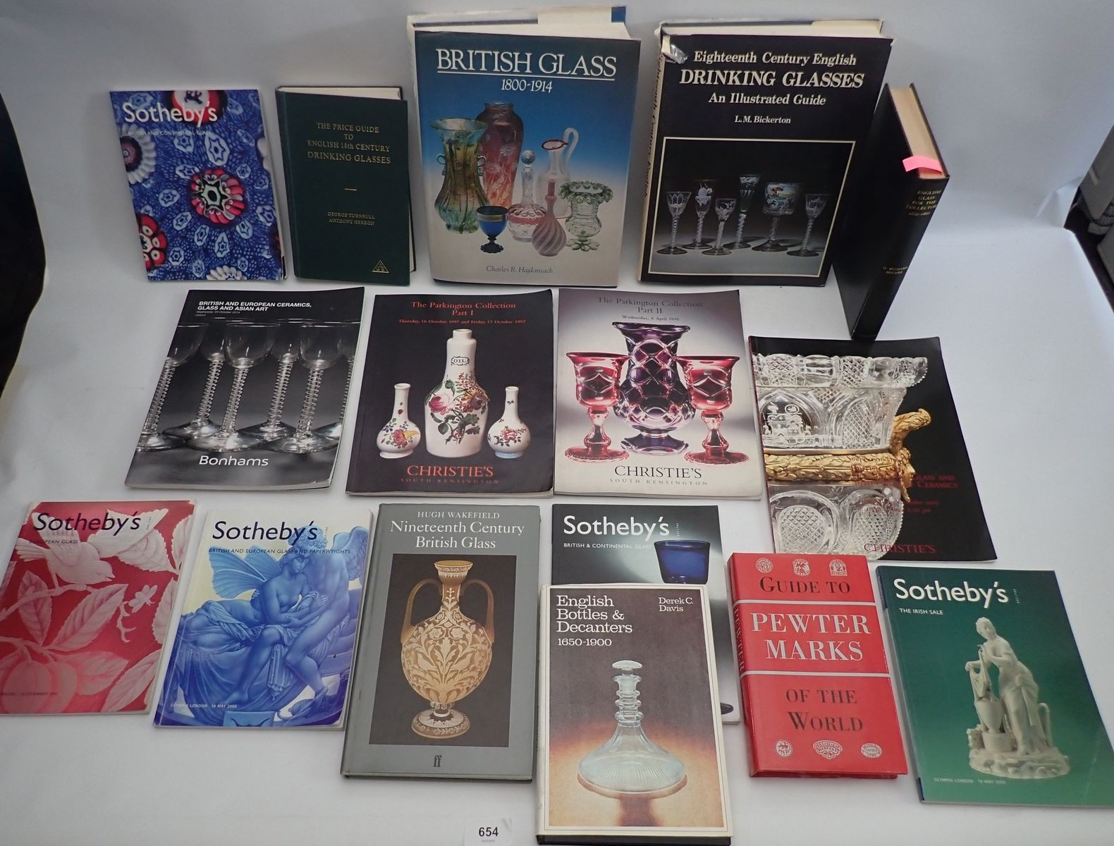 A box of books on antique glass and pewter etc