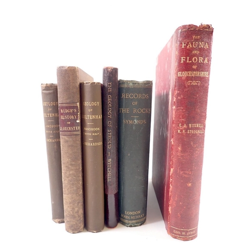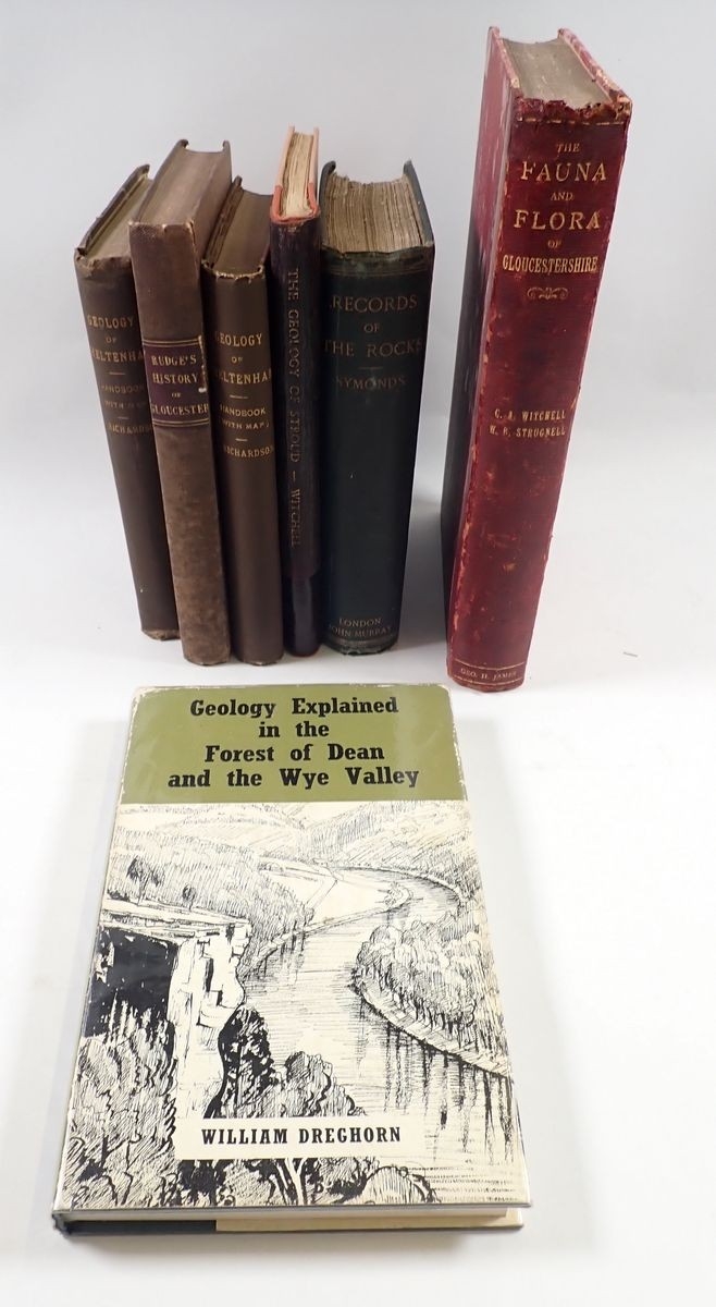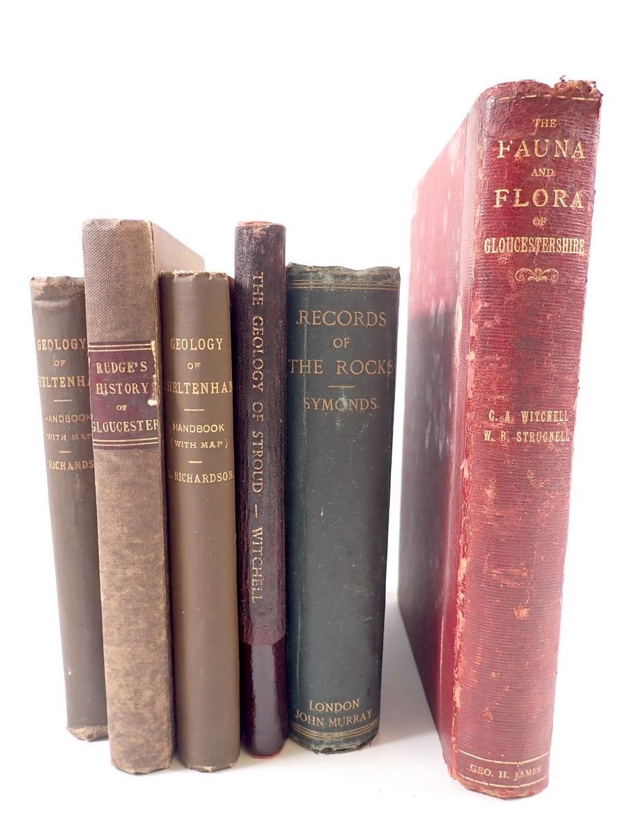A group of books on the geology of Gloucestershire including The Geology of Stroud by Witchell, Geology of Cheltenham Handbook by L Richardson