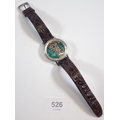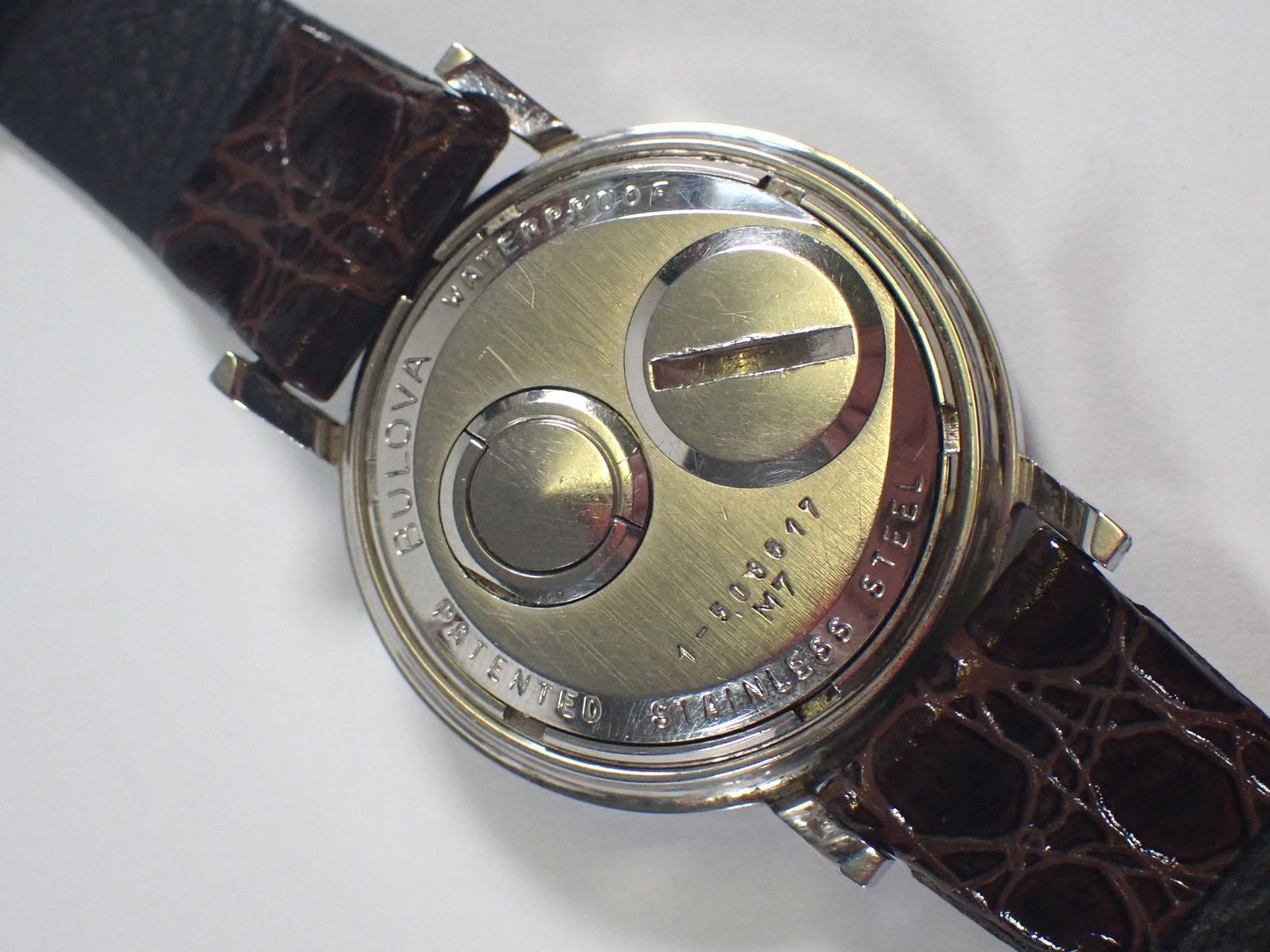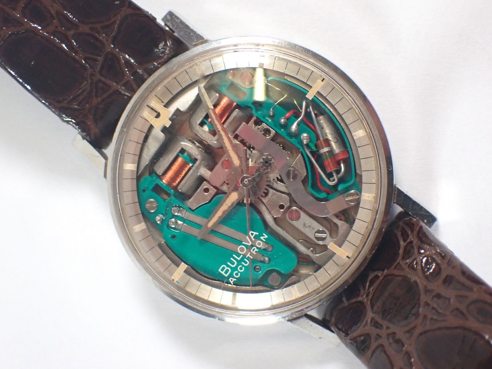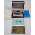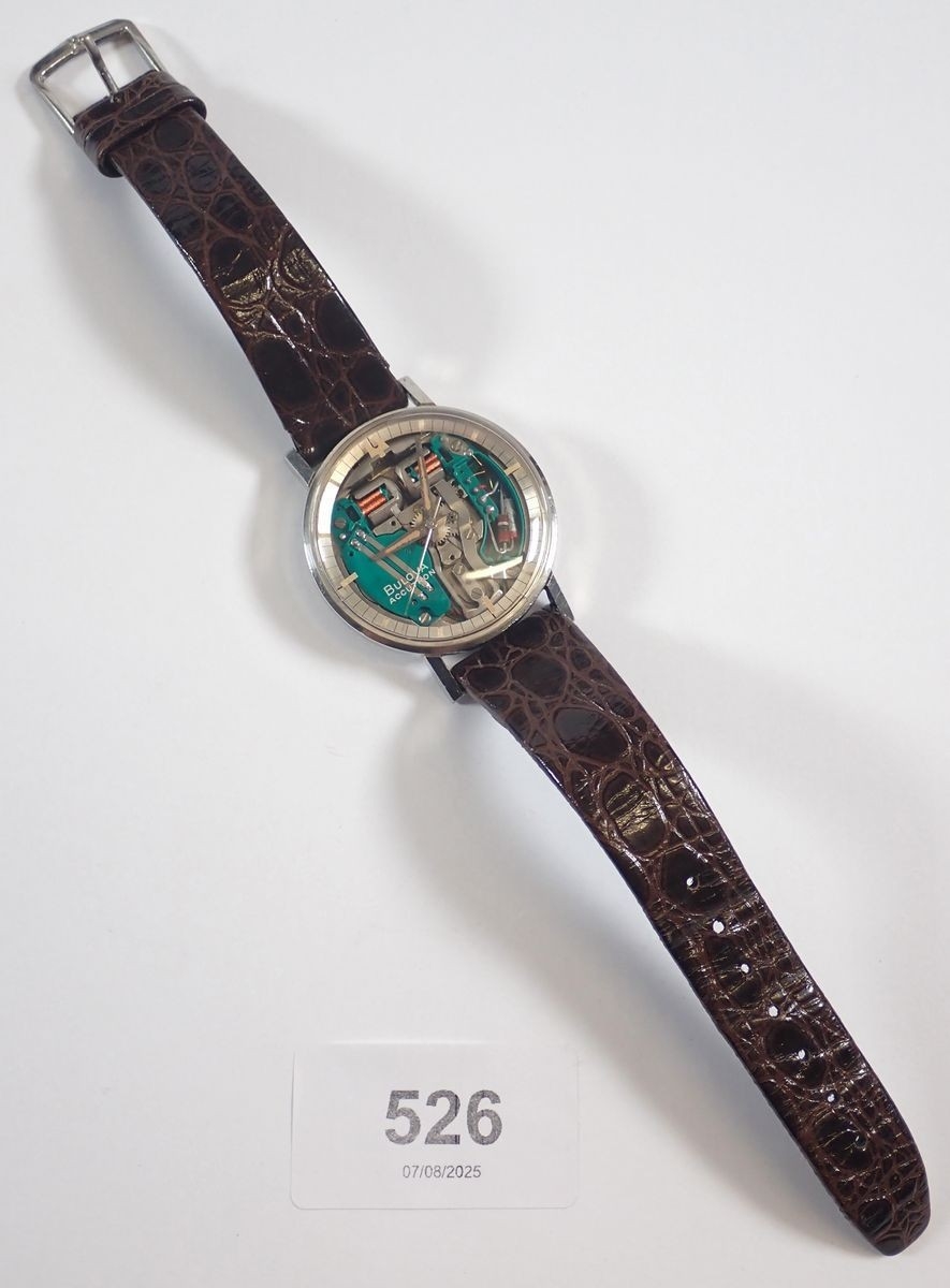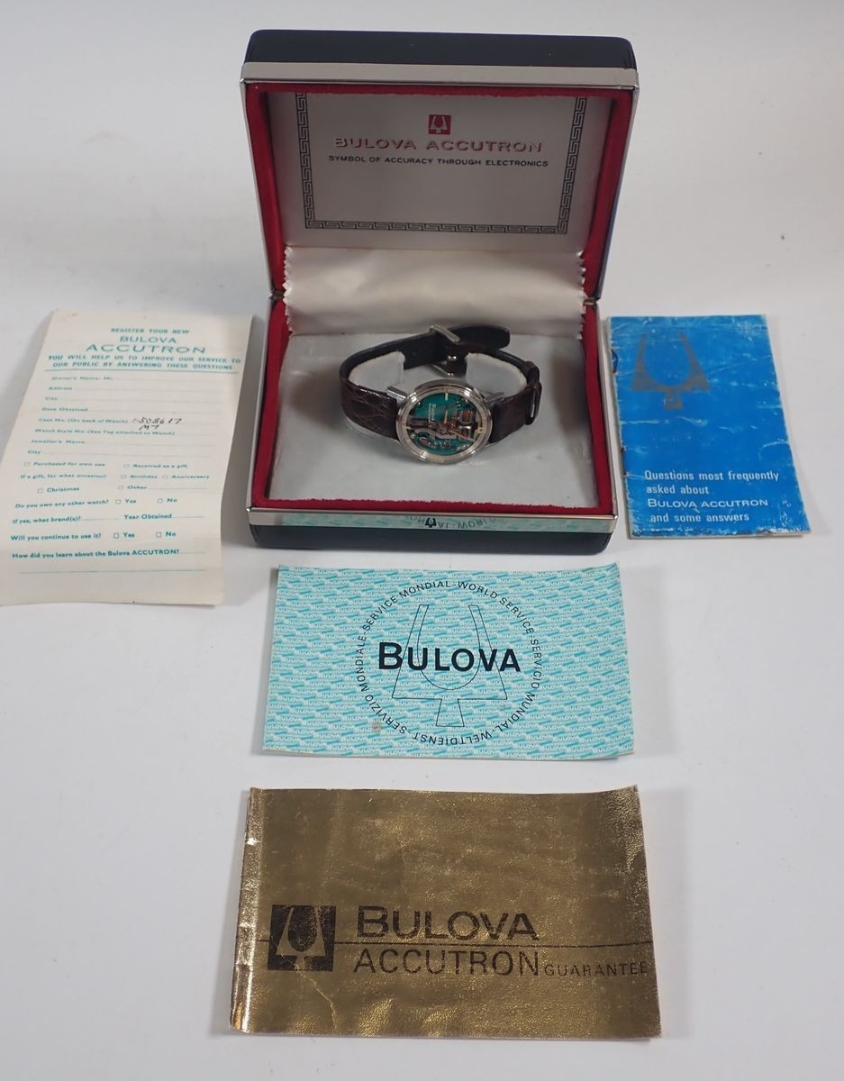 A Bulova Accutron Spaceview skeleton dial stainless steel gentleman's watch on leather strap in original box and paperwork, dated 1971